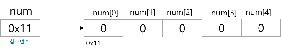 변수 num은 저장공간이 아닌 참조 변수 이며, 값을 저장할 수 있는 공간은 num[0]부터 num[4]까지로 모두 5개이다.