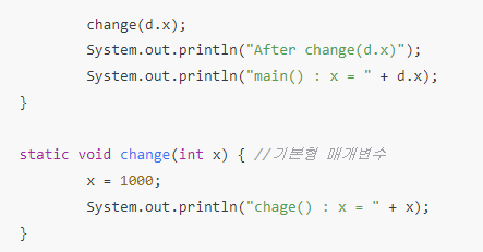 'change(d.x);'로 change메서드를 호출한다. d.x값에는 10이라는 값이 저장되어 있고, 그 값이 매개변수 x값에 저장된다.