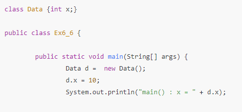 'd.x = 10;' 이 문장은 d가 가리키는 '객체 x'에 10을 저장하라는 뜻으로 다음 문장에서 println메서드가 x값으로 10을 출력한 다.