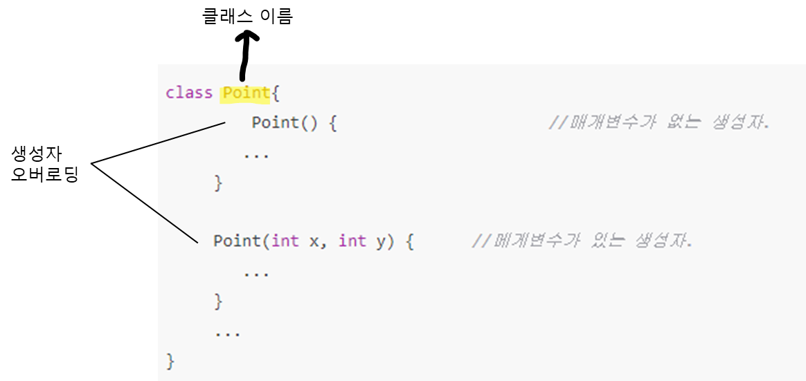 - 생성자 오버로딩은 클래스 이름과 생성자의 이름이 같아야 한다.