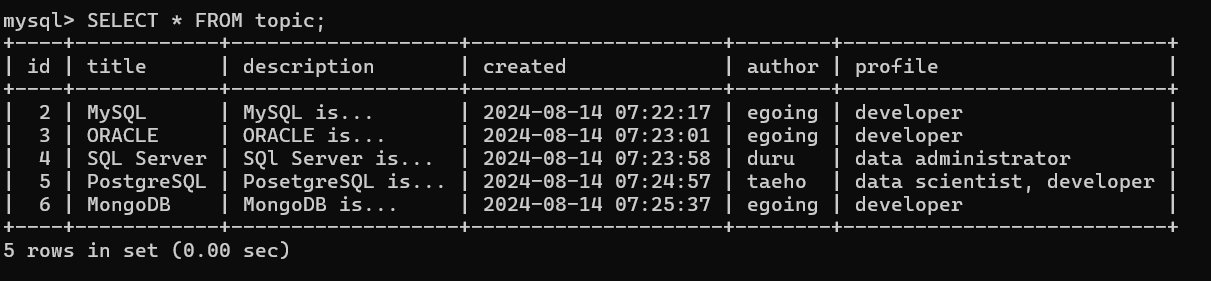 | [생활코딩] MySQL 데이터 삭제 : DELETE (0) | 2024.08.14 |